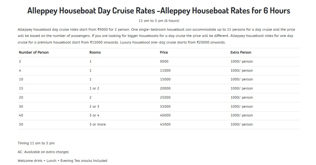 - Minimum 2 persons and maximum 150 persons for Alleppey day cruise houseboats.